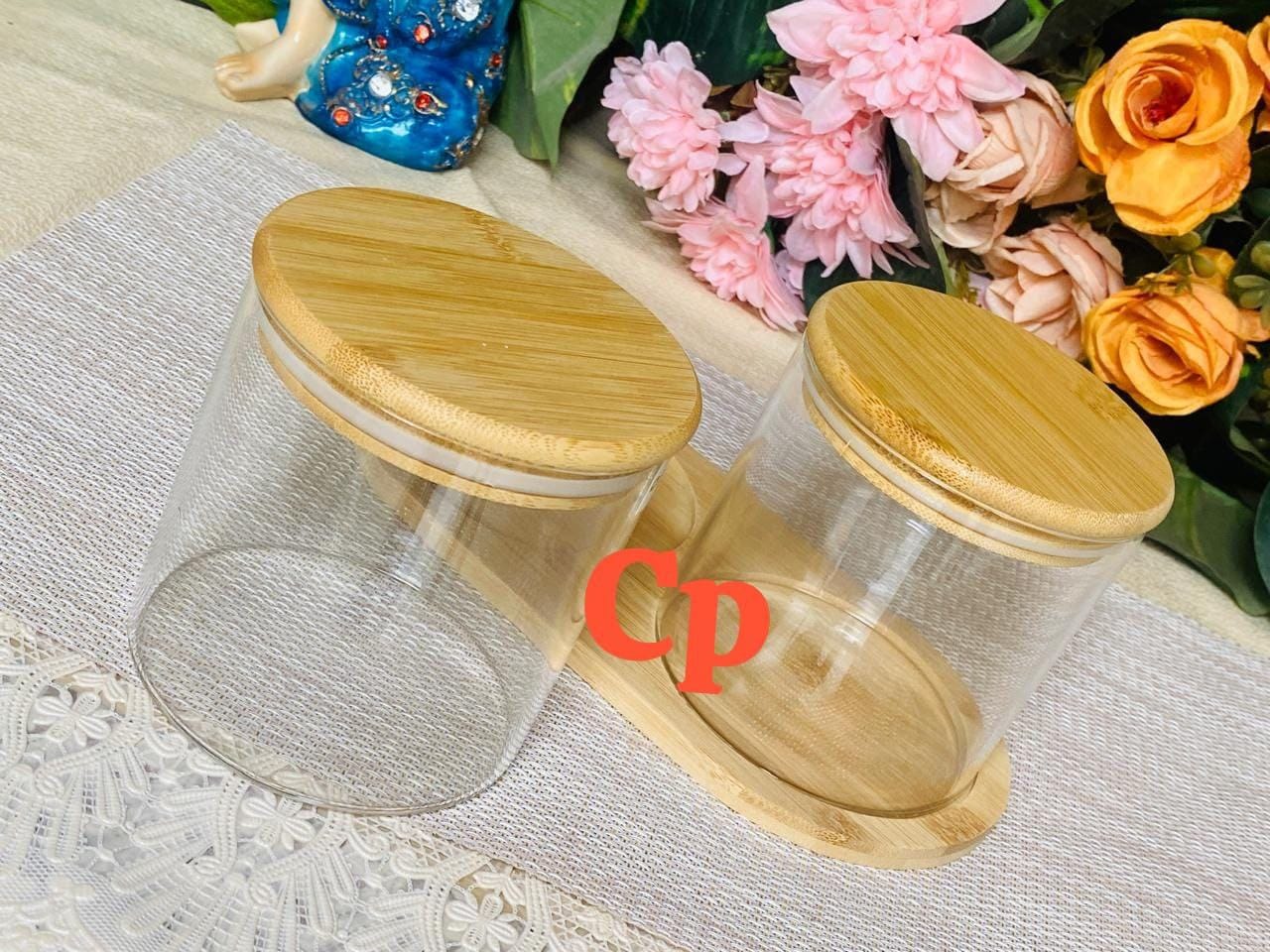 Borosilicate Glass Storage Jar with Bamboo Lid & Tray (Set of 2 & 1pc Tray) 600 ml Each Airtight Multipurpose Glass Jars for Spices Dry fruits sugar. keep dry foods such as biscuits , cookies or tea-time snacks neatly stored away and hygienically safe with our beautiful jar set created from clear glass. Simple , contemporary and made to be seen, this storage jar is made from high quality glass and wooden tray. Featuring a wooden airtight silicone lid, it is perfect for storing and keeping food fresh for a longer time. A neat contemporary style, this shape is a statement in itself and gives a modern feel to your home.