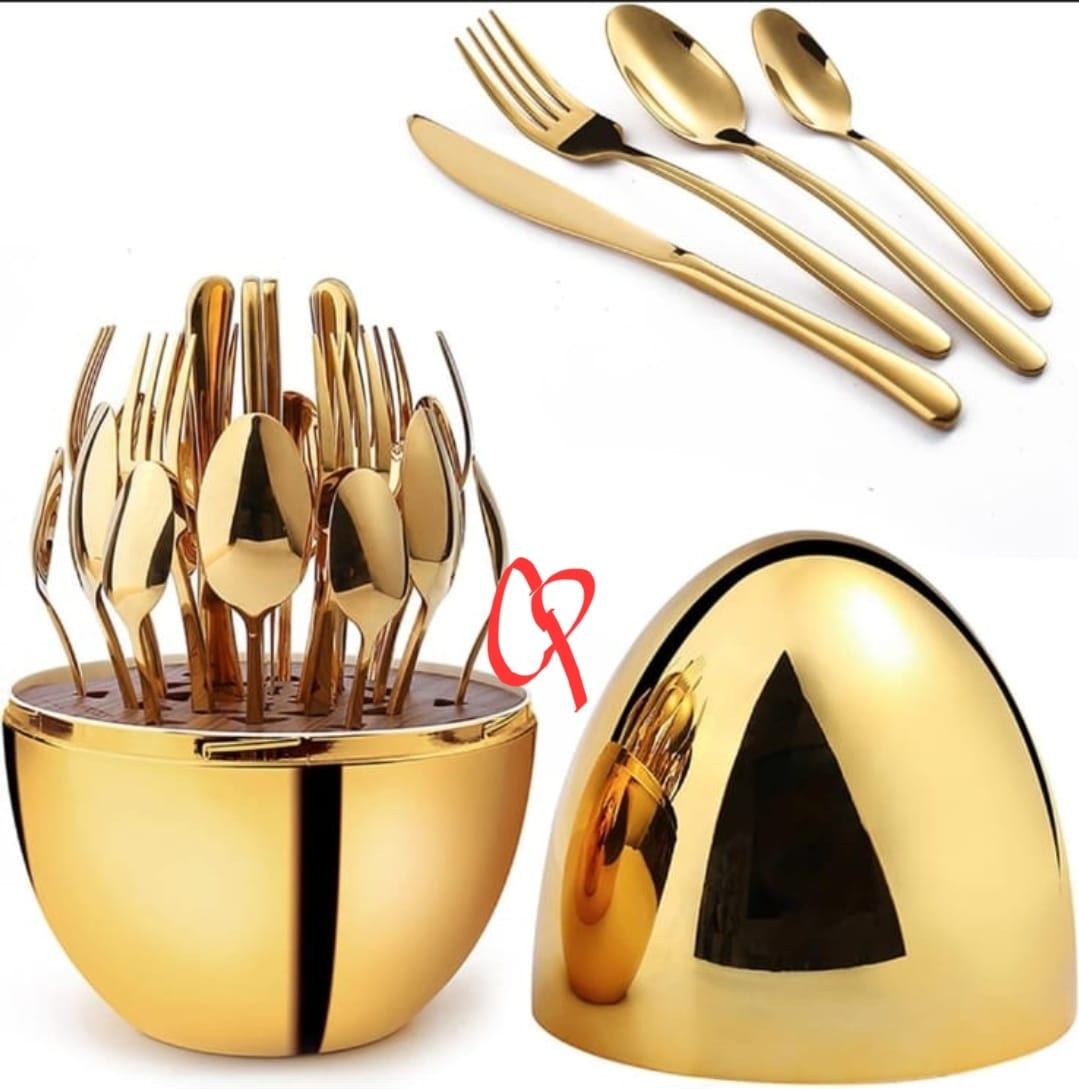 Premium Cutlery Set 24 Pcs with Oval Shaped Stand Beautiful Style Oval Designed Cutlery Sets 6 full spoon, 6 fork, 6 knife , 6 dessert spoon (Golden) .